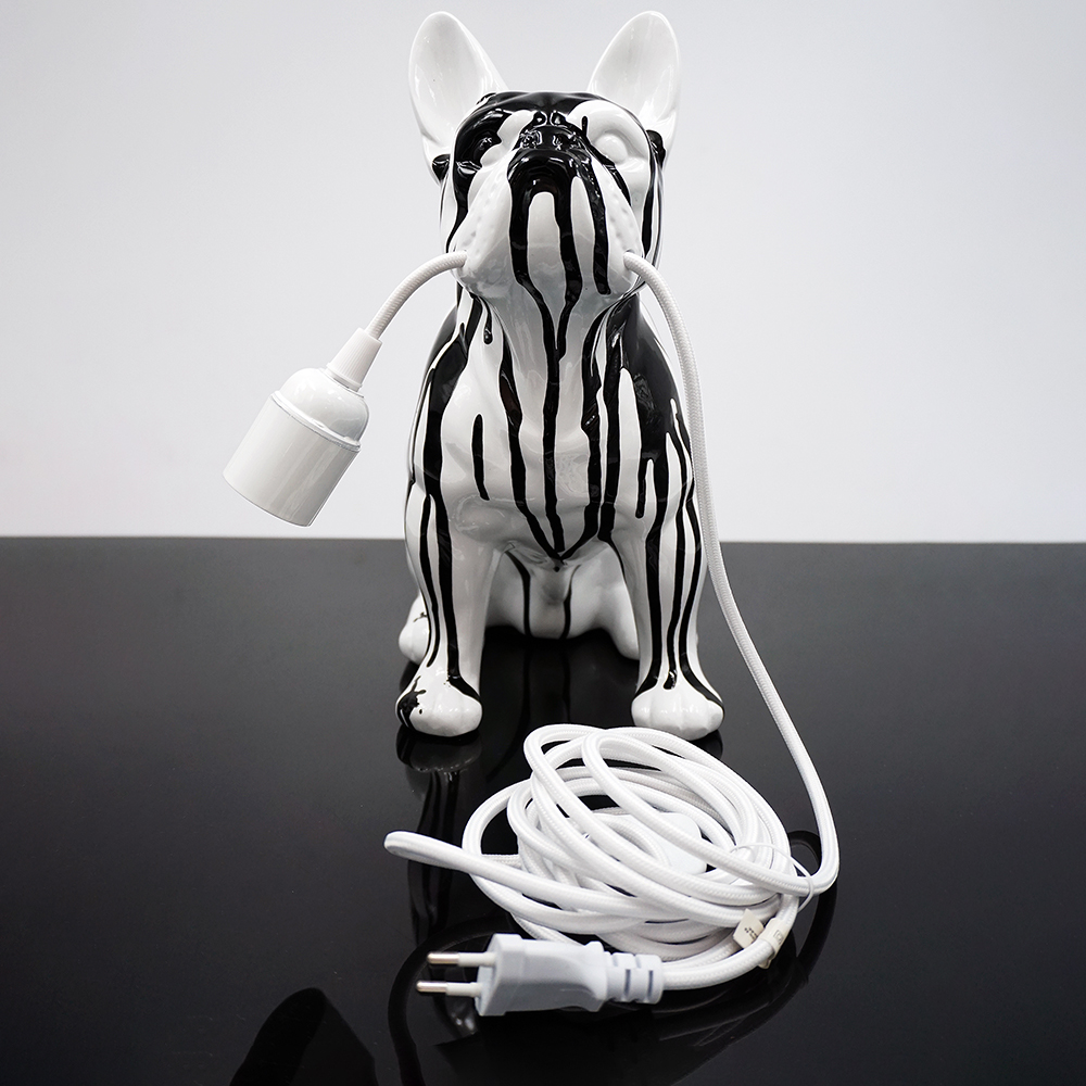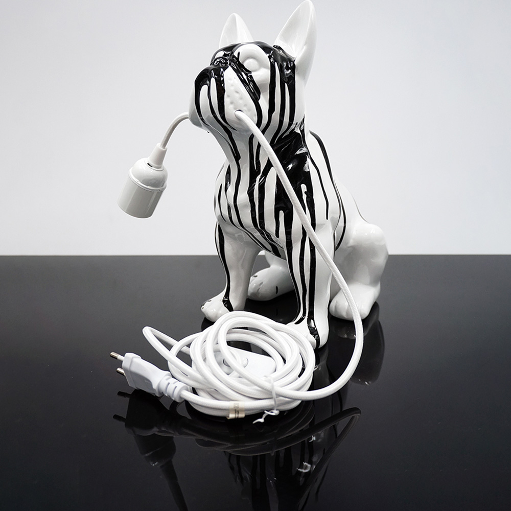 White decorative figure with a black trash – French bulldog lamp with a white cable.