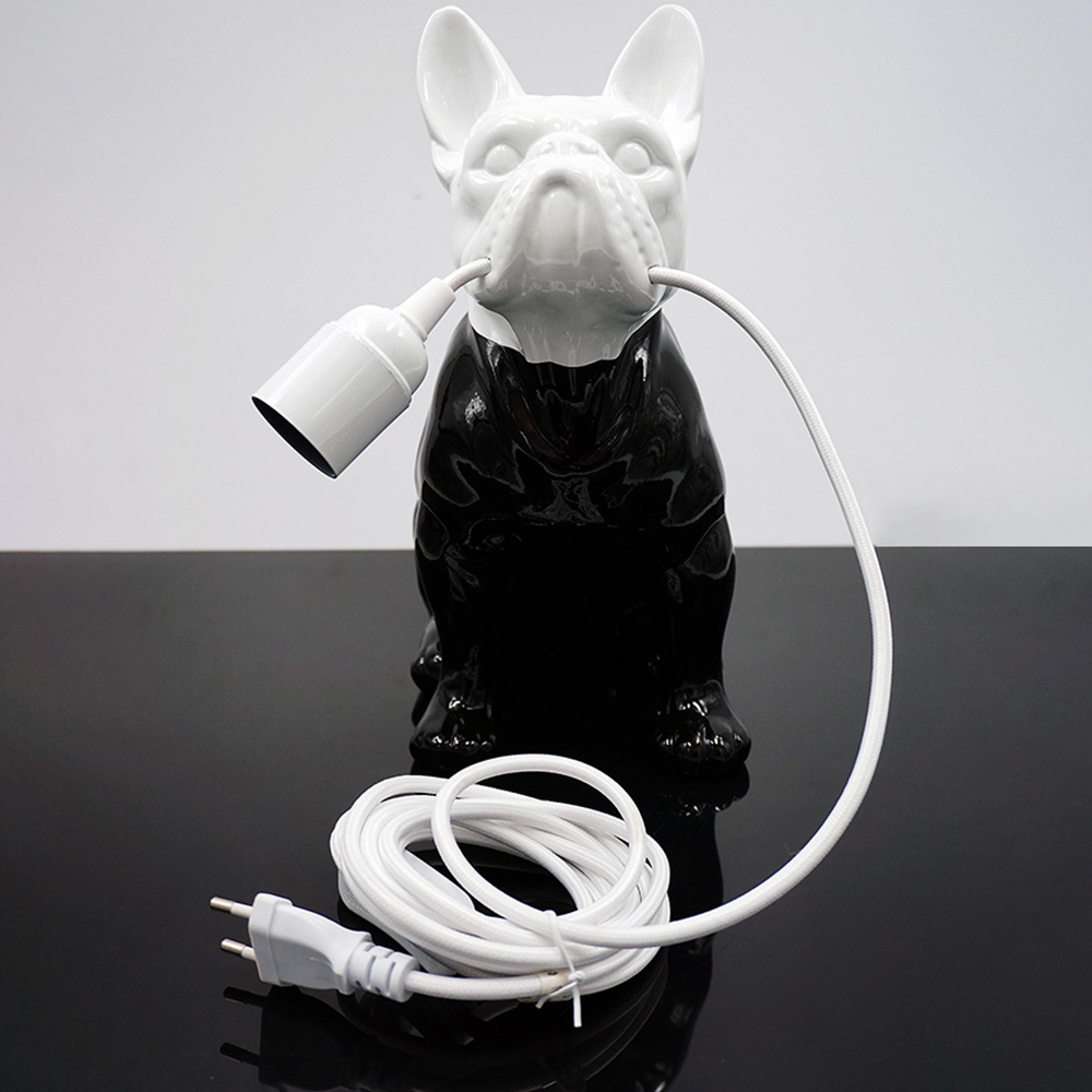 Black decorative figure with a white head – French bulldog lamp with a white cable.