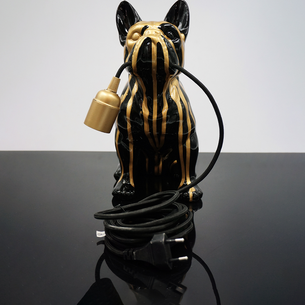 Black decorative figure with golden accents – French bulldog lamp with a black cable.