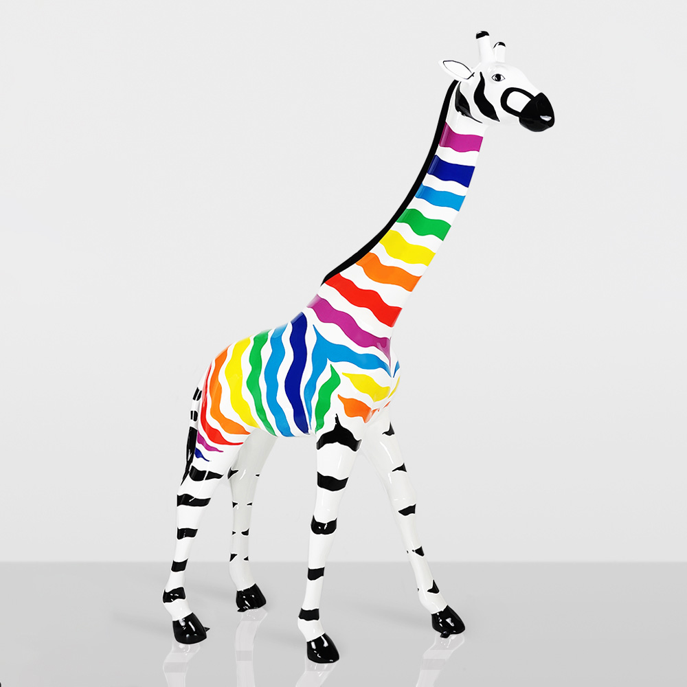 The giraffe in colorful zebra stripes is an excellent choice for various events, advertising, and as decoration in stores or gardens. Its original design and vibrant colors make it the focal point of any space, attracting attention and becoming a topic of conversation.